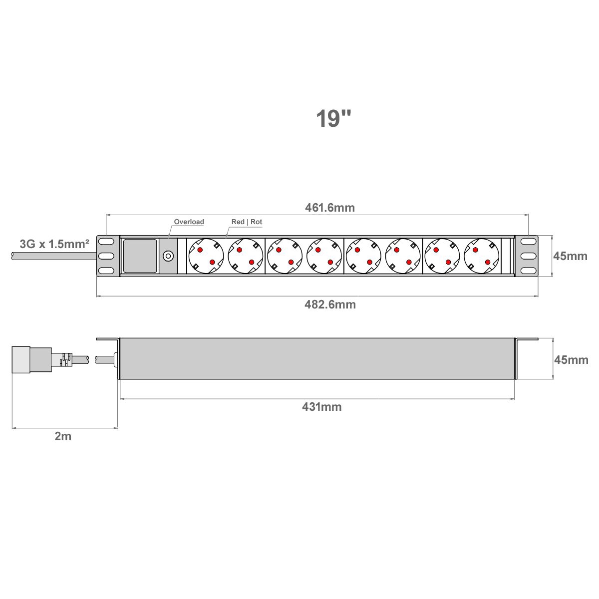 Die 8-fach Steckdosenleiste ist speziell für die Montage in 19" Racks konzipiert. Das wertige und stabile Metallgehäuse hat seitlich die entsprechenden Metallwinkel.