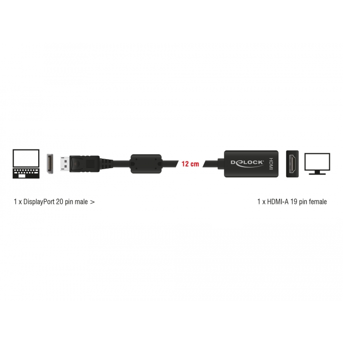 Adapter DisplayPort auf HDMI, kurzes Adapterkabel DisplayPort-Stecker männlich auf HDMI-Buchse weiblich, unterstützt 1920x1200 @ 60Hz, ca. 20cm, mit interner Elektronik