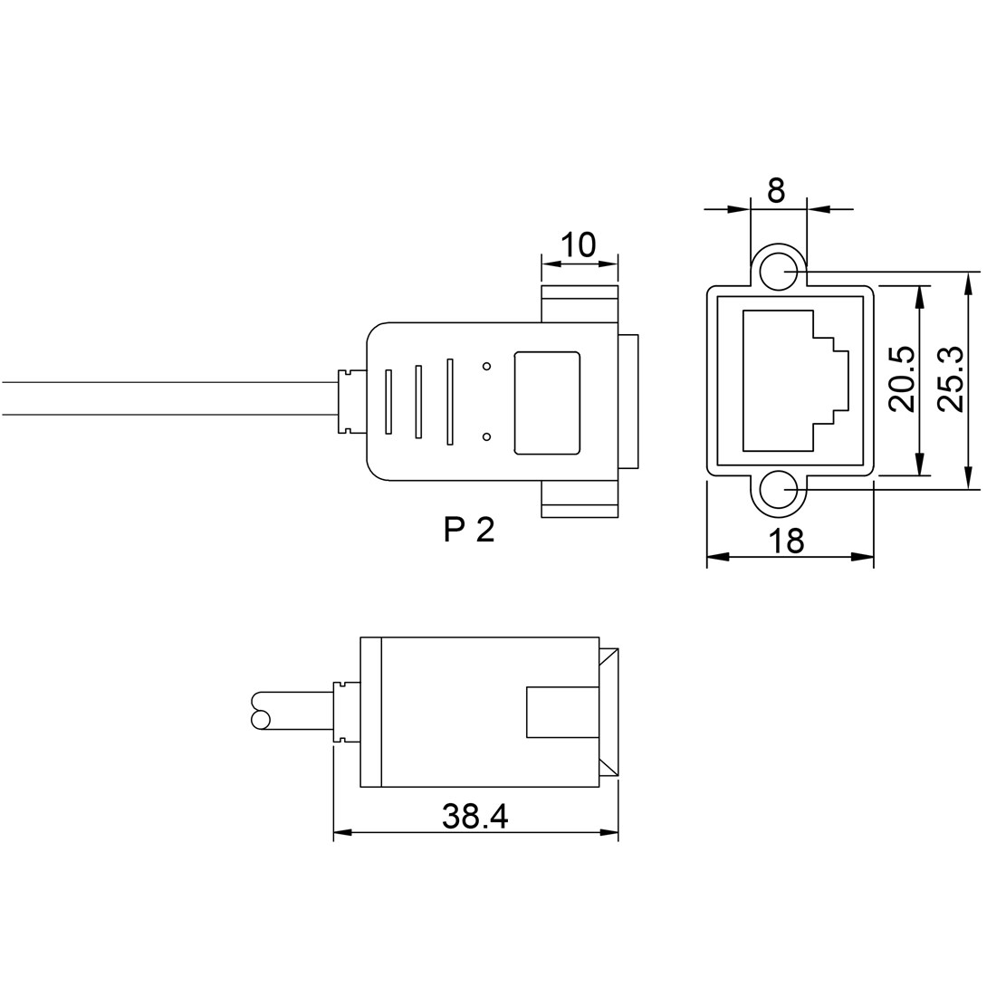 - ANSCHLUSS 1: RJ45-Buchse anschraubbar (8P8C) mit Schraubenabstand (Lochabstand zur Befestigung) 25mm