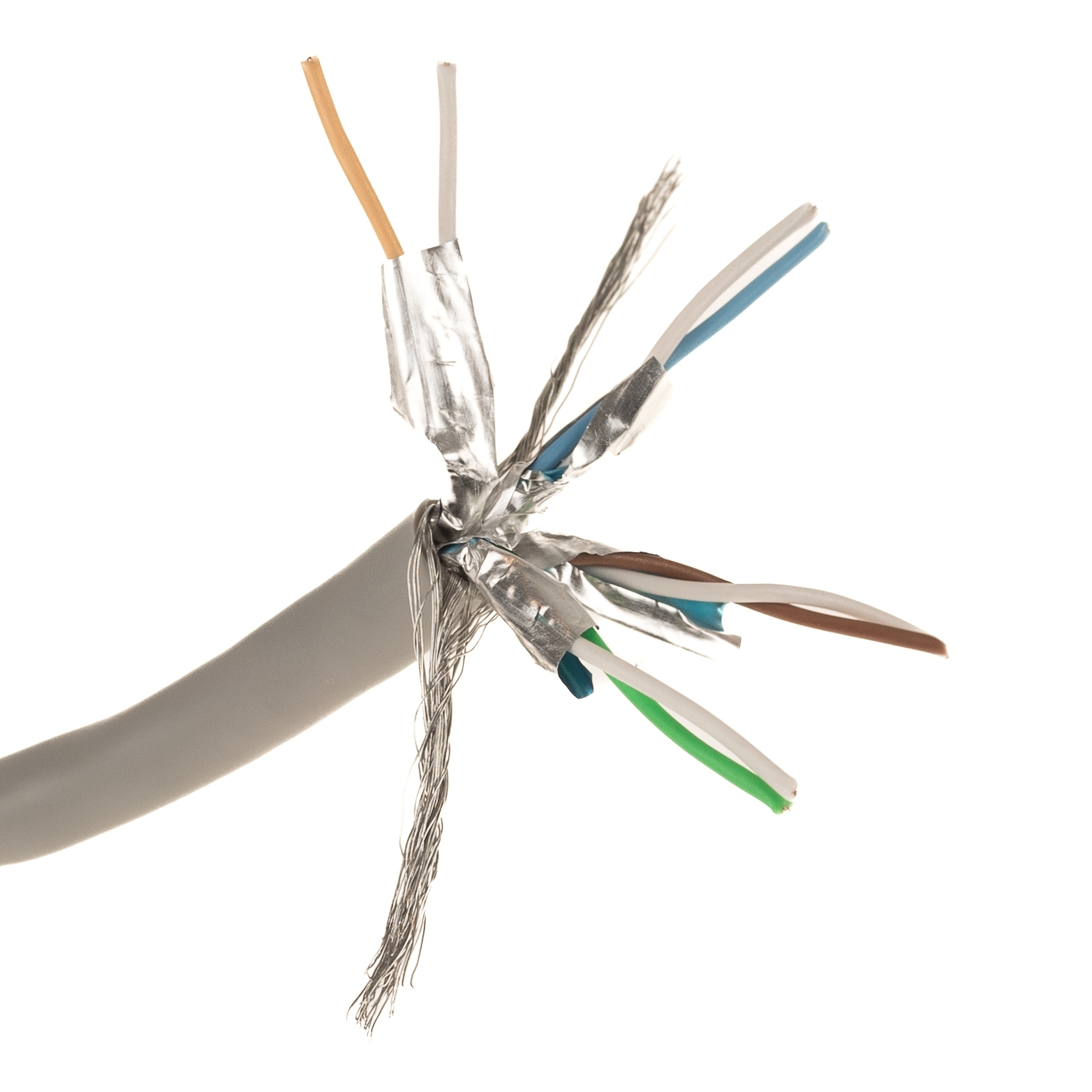 Intern ist jedes der 4 verdrillten Adernpaare mit einer dicken, flexiblen Aluminiumfolie umwickelt. Diese Schirmungsart nennt sich PiMF, "Pairs in Metall Foil". Die äußere Abschirmung ist ein verzinntes Kupferdraht-Geflecht. Die Kupferadern der Netzwerkkabel sind mit AWG27 etwas dicker als normal ausgeführt.