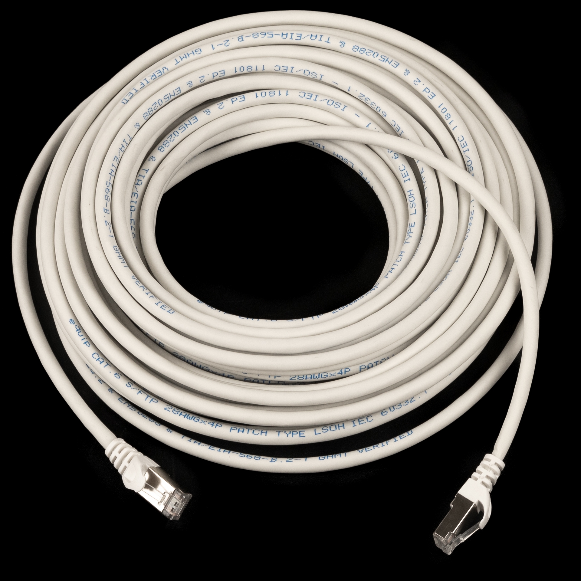 Cat.6 Netzwerkkabel / Patchkabel, 15m, Vollkupfer-Litzen, 2-fach Schirmung S/FTP (PIMF), 250Mhz, halogenfreier Mantel (LSZH), Gigabit-fähig, 2x RJ45-Stecker vergossen, weiß