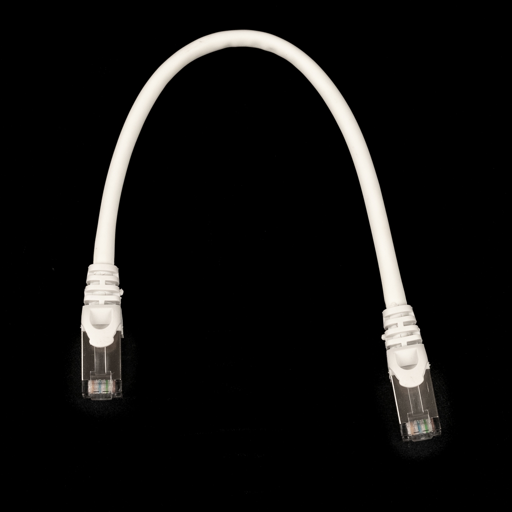 Cat.6 Netzwerkkabel / Patchkabel, 25cm, Vollkupfer-Litzen, 2-fach Schirmung S/FTP (PIMF), 250Mhz, halogenfreier Mantel (LSZH), Gigabit-fähig, 2x RJ45-Stecker vergossen, weiß