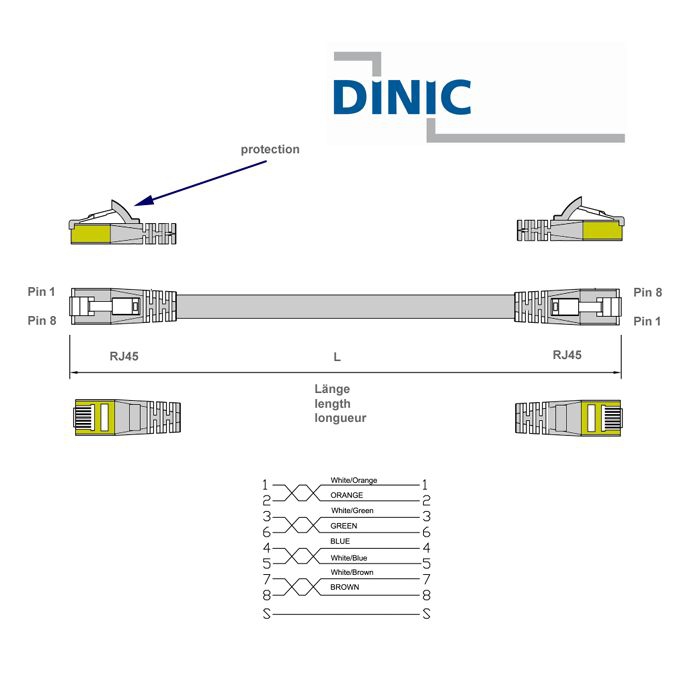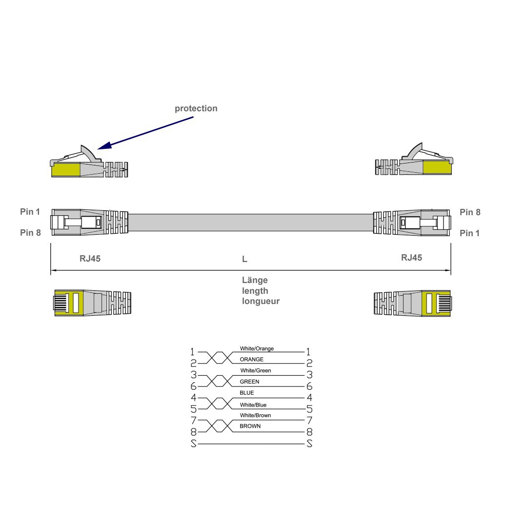 Die Stecker des Flachkabels stehen im Vergleich zu normalen RJ45-Steckern nicht weit raus. Die Bauform wurde miniaturisiert. Das spart Platz! Die Stecker PIN-Belegung ist 1-zu-1 für alle 8 Kontakte, was dem Netzwerkstandard (EIA/TIA 568B) entspricht.