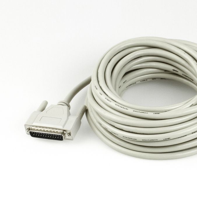 Der DSub-Stecker hat 25 Kontaktstifte (verteilt auf 2 Reihen) im Abstand von 2.54mm (1/10 Zoll). Die Handrändel-Schrauben sind vom Typ UNC 4/40. Beides entspricht dem Marktstandard. Die Belegung des Kabels ist 1 zu 1 (alle 25 Pins).