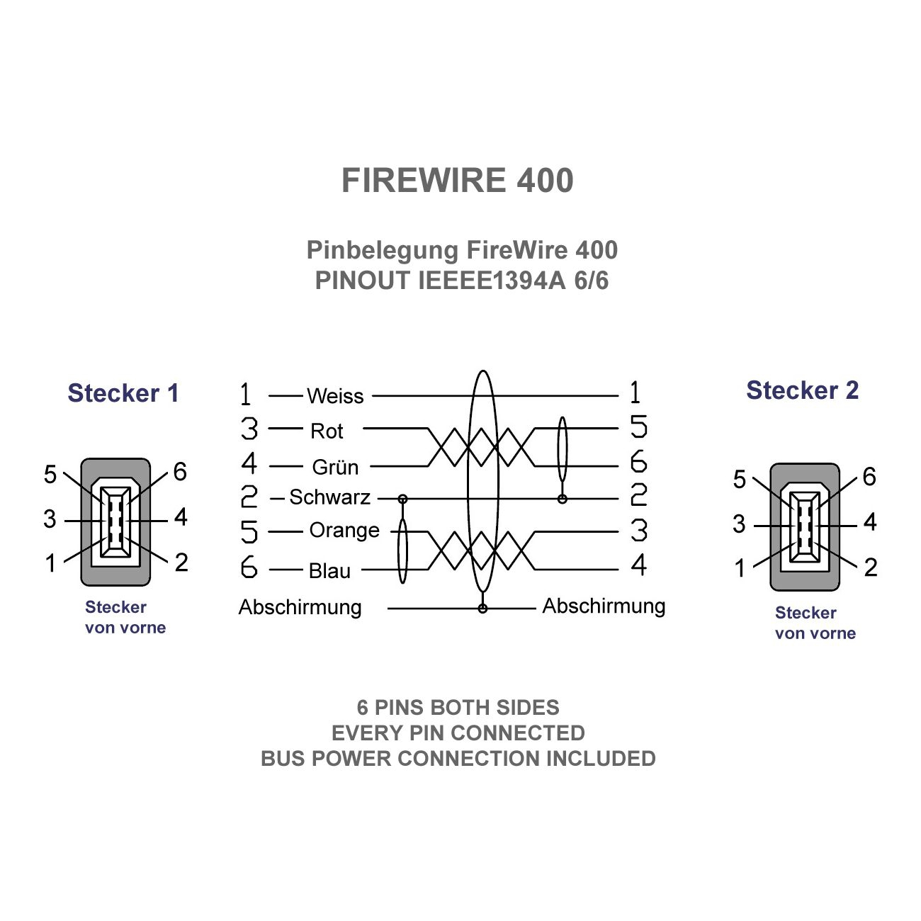 Die interne Belegung des Kabels umfasst neben den 4 Datenleitungen auch die 2 Adern für Bus-Power. Externe Geräte, die keine eigene Stromversorgung haben, können so über den Firewire-Port des Rechners mit Strom versorgt werden.