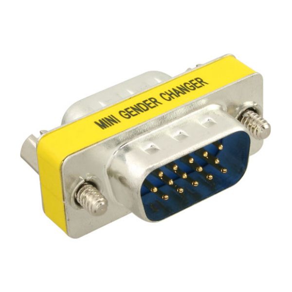 Dieser Adapter wird dazu verwendet, einen HD-DSub-Anschluß (3-reihig, 15-polig) von Buchse in Stecker umzuwandeln. Typischerweise ist dies VGA ("Video Graphics Array"-Bildschirmanschluss).