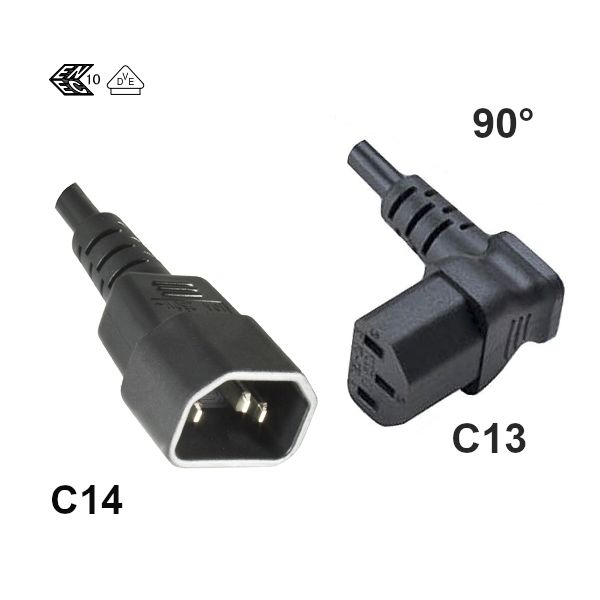 Kaltgeräteverbinder vom Typ IEC-60320 C13 werden für den Stromanschluss von Geräten verwendet, die im Betrieb keine oder kaum Wärme entwickeln. Dies sind z.B. PCs. Durch die 90° Winkelung sparen Sie Platz. Die maximale Temperatur des Steckers darf 70 °C nicht überschreiten und der maximale Stromdurchfluss ist auf 10 A festgelegt.