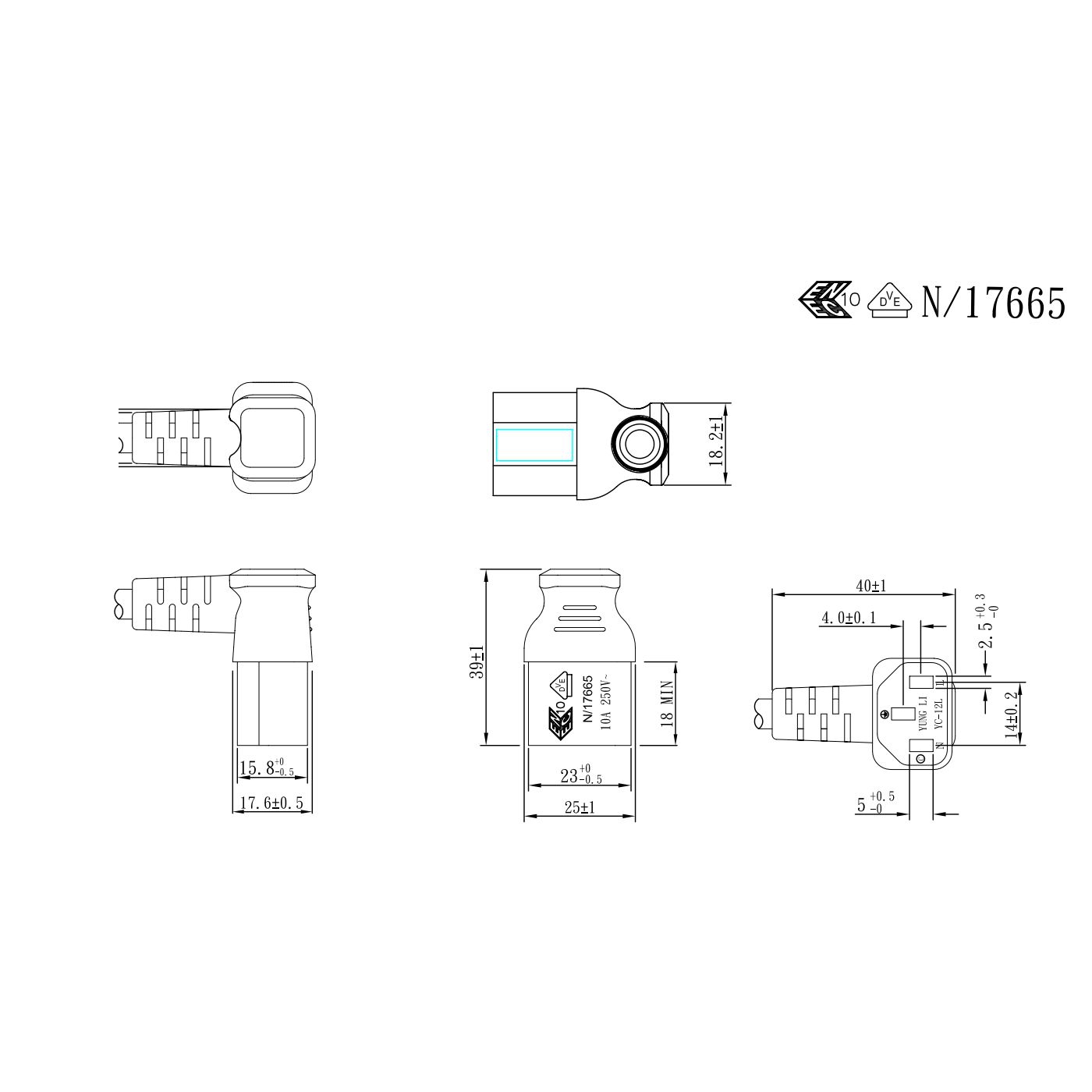 Der 90° gewinkelte Netzstecker ist ausgeführt als Kombistecker-Typ E+F gemäß CEE-7/7-System. Durch das CEE-7/7-System wird die Verwendbarkeit des Kabels auch in französisch geprägten Gebieten sichergestellt (Belgien, Marokko, Monaco, Polen, Slowakei, Tschechien, Tunesien, Frankreich und ein Teil der ehemaligen Kolonien). Die Schutzkontakt-Steckerart CEE 7/7 E+F hat ein ergänzendes Loch für den französischen Erdungszapfen.