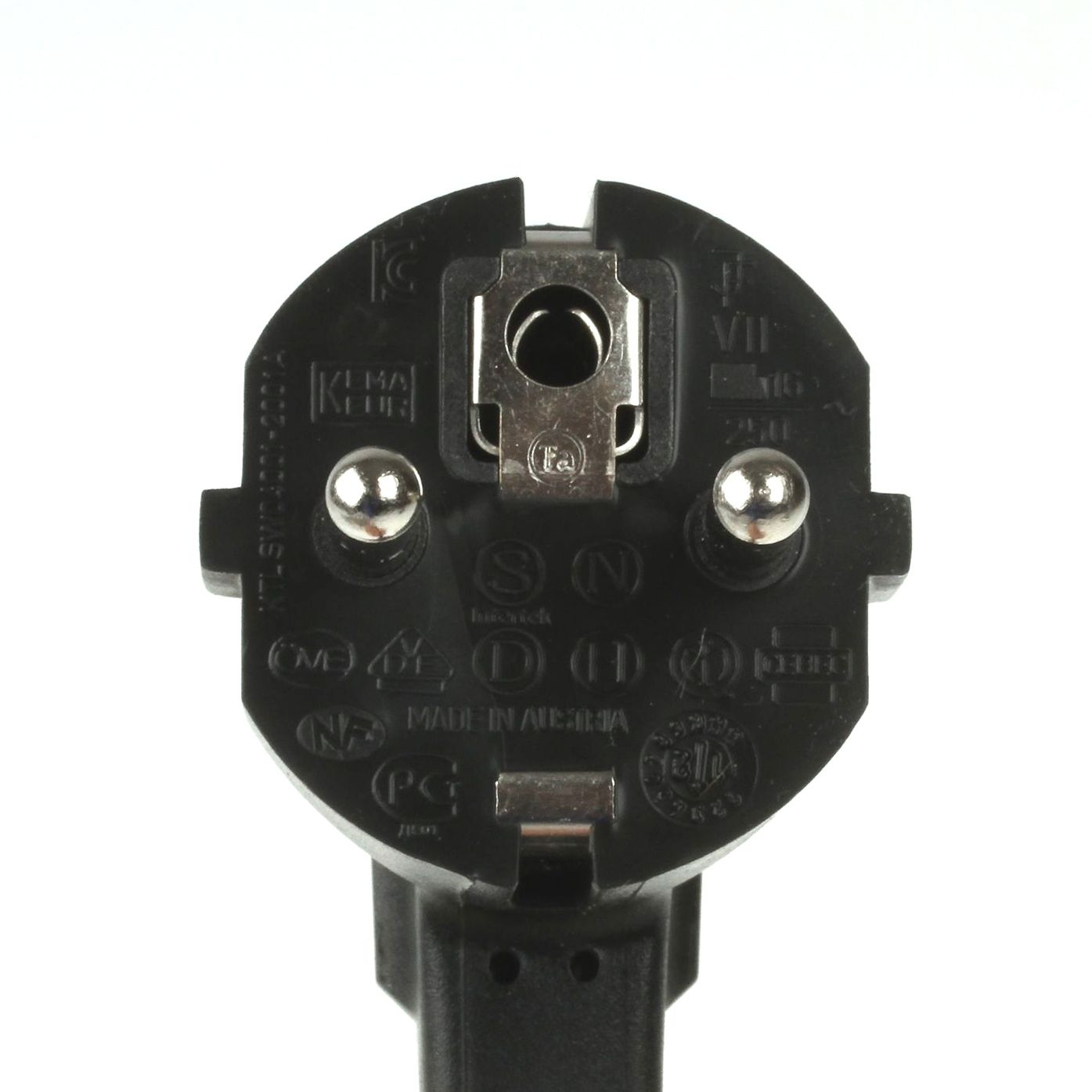 Der gewinkelte Stromnetz-Stecker ist ausgeführt als Kombistecker-Typ E+F gemäß CEE-7/7-System. Durch das CEE-7/7-System (eine Steckerart mit einem ergänzenden Loch für den französischen Erdungszapfen) wird die Verwendbarkeit des Kabels auch in französisch geprägten Gebieten sichergestellt (Belgien, Marokko, Monaco, Polen, Slowakei, Tschechien, Tunesien, Frankreich und ein Teil der ehemaligen Kolonien).