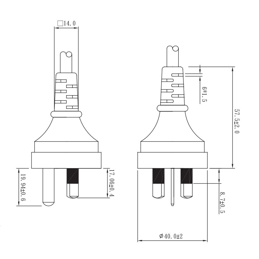 Um eine sichere Handhabung der Stecker zu gewährleisten, sind 2 Stiftkontakte des australischen Stromkabels teilisoliert.