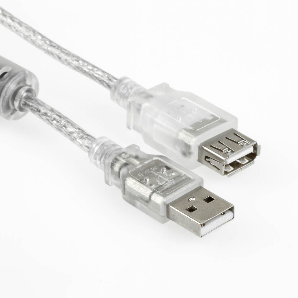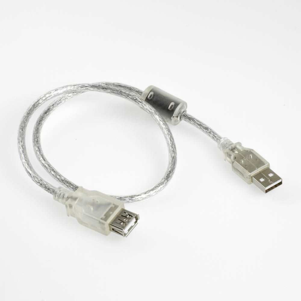 USB 2.0 Verlängerungskabel mit FERRITKERN, EXTRA KURZ 50cm, Typ: AA Stecker/Buchse, für USB 1.1 und USB 2.0 (bis 480 MBit/s), Farbe: transparent-silber