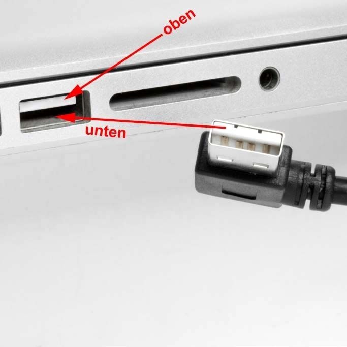 Wir bezeichnen das Kabel als 90° NACH RECHTS abgewinkelt. Bitte prüfen Sie die Ausrichtung der USB-A-Buchse Ihres PCs. Sie müssen die Position des weißen Kontakt-Trägers in der USB-A-Buchse beachten. Möglicherweise ist das, was wir als 'nach rechts' bezeichen bei Ihnen nach oben, unten oder links. Bitte schauen Sie sich obige Beispielanwendungen und Winkelrichtungen an.