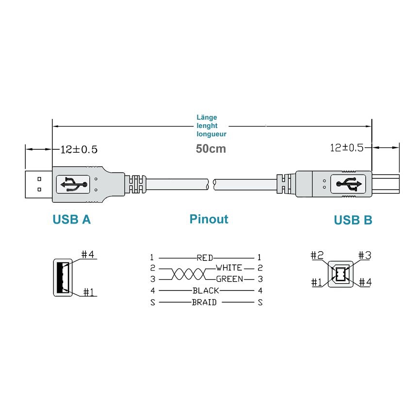 Kurzes USB 2.0 Kabel PREMIUM-QUALITÄT A-auf-B silber-transparent 50cm