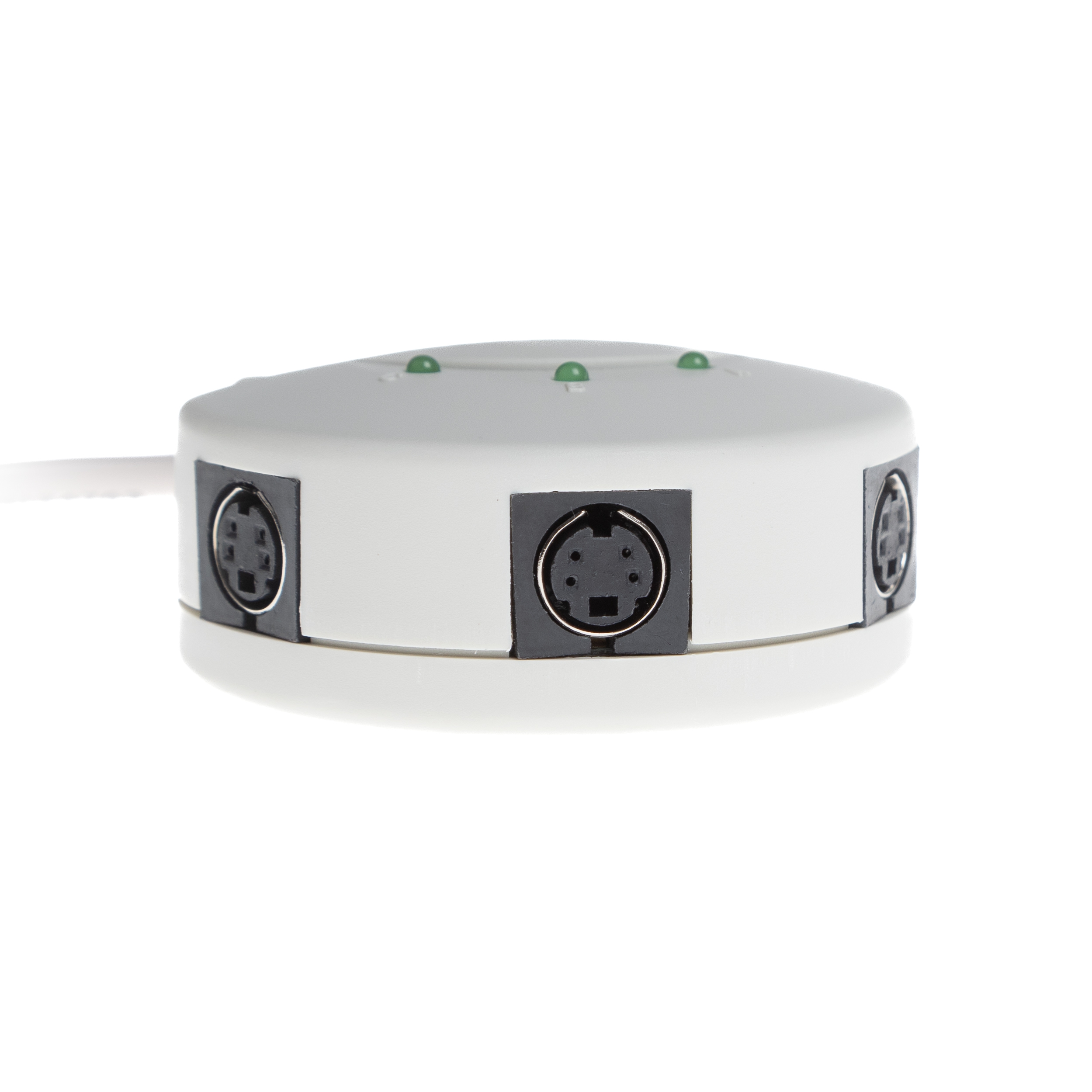 - Mini-DIN-4-Stecker (männlich) an Umschaltbox mit drei Mini-DIN-4-Ports (weiblich)