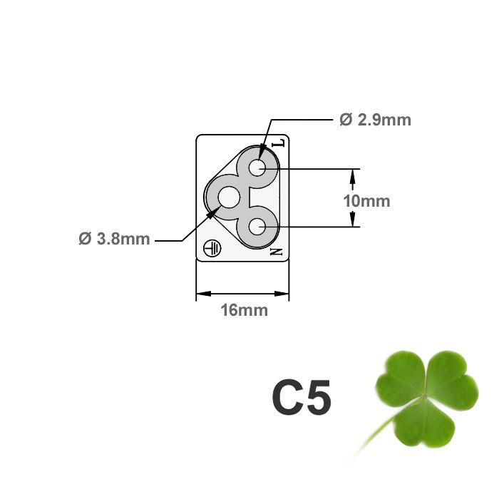 In der Welt des Kabel-Business wird der Kleeblatt-Stecker auch als "Mickey Mouse" Stecker bezeichnet wird. Die offizielle Bezeichnung ist IEC-60320 C5. Die maximale Temperatur des Steckers darf 70° C nicht überschreiten und der maximale Stromdurchfluss ist auf 2,5 A festgelegt.