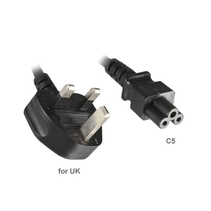 Notebook-Stromkabel für GROSSBRITANNIEN, 1.8m, UK-Stecker (mit Sicherung) an 3-poligen NB-Stecker (3 kreisrunde Kontakte als V angeordnet, IEC-C5), 3G x 0,75mm², schwarz