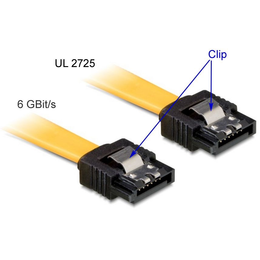 Beide SATA-III-Stecker sind mit einem Metall-Clip ausgestattet. Dieser Clip sorgt für einen festen Halt des SATA-Steckers in der Buchse. Eine zuverlässige Datenverbindung wird so sichergestellt.