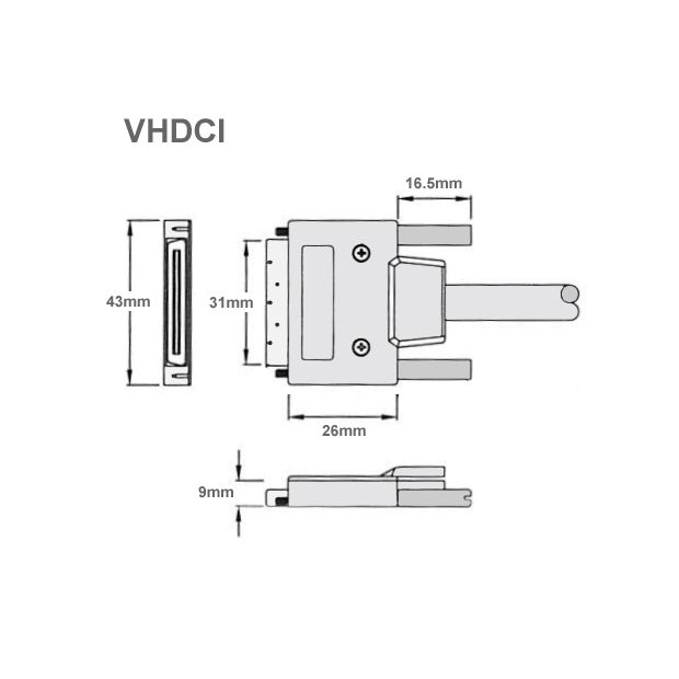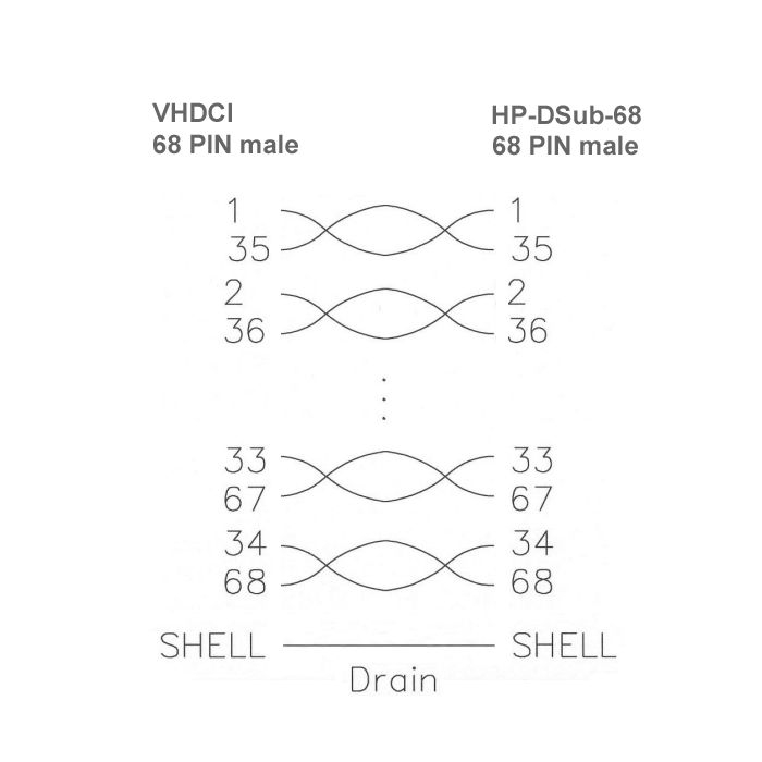 - VHDCI Typ 68-polig männlich (hat mittigen Kontaktsteg, Pitch 0.8mm)