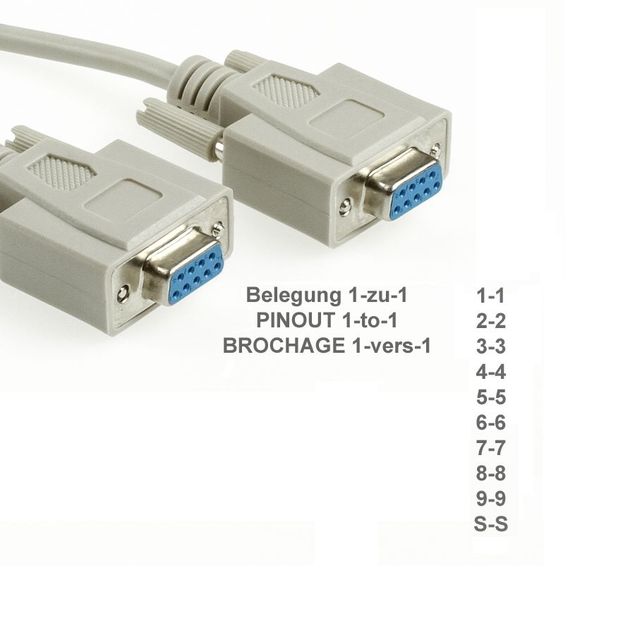 - alle 9 Kontakte 1-zu-1 verbunden (kein NULL-Modem Pinout)