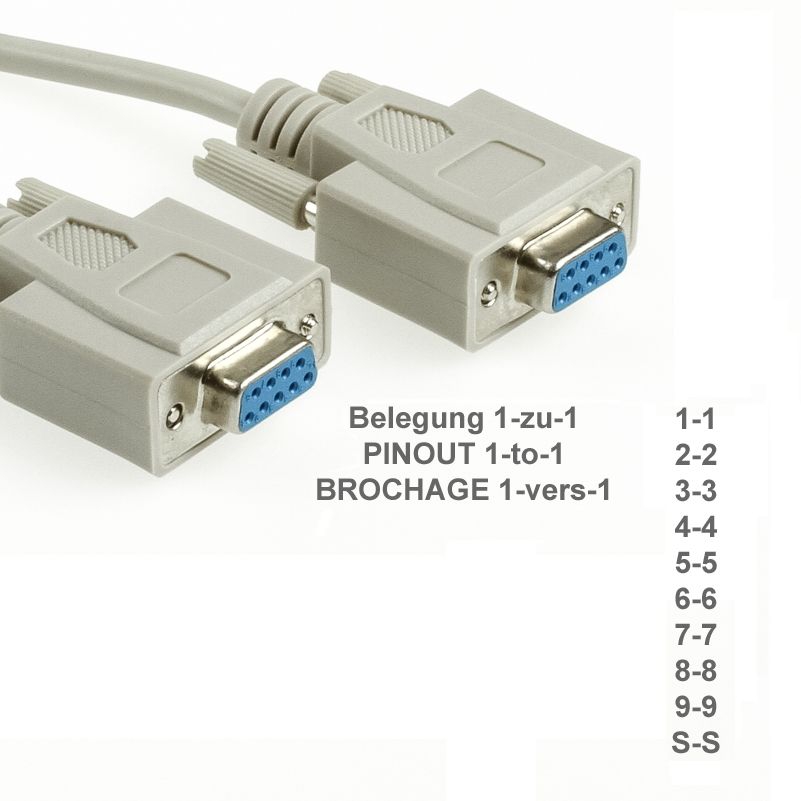 Das hier angebotene Buchse/Buchse-Kabel hat beidseitig 9 Kontaktlöcher und ist intern 1:1 belegt, d.h. alle Kontake sind ohne Überkreuzung miteinander verbunden (1-1, 2-2, 3-3, 4-4, 5-5, 6-6, 7-7, 8-8, 9-9, Abschirmung-Abschirmung). Kabel vom Typ C3-09-xx können mit einem Gender Changer vom Typ DSub-9 männlich/männlich (partsdata Art.Nr. K-100) kombiniert werden.