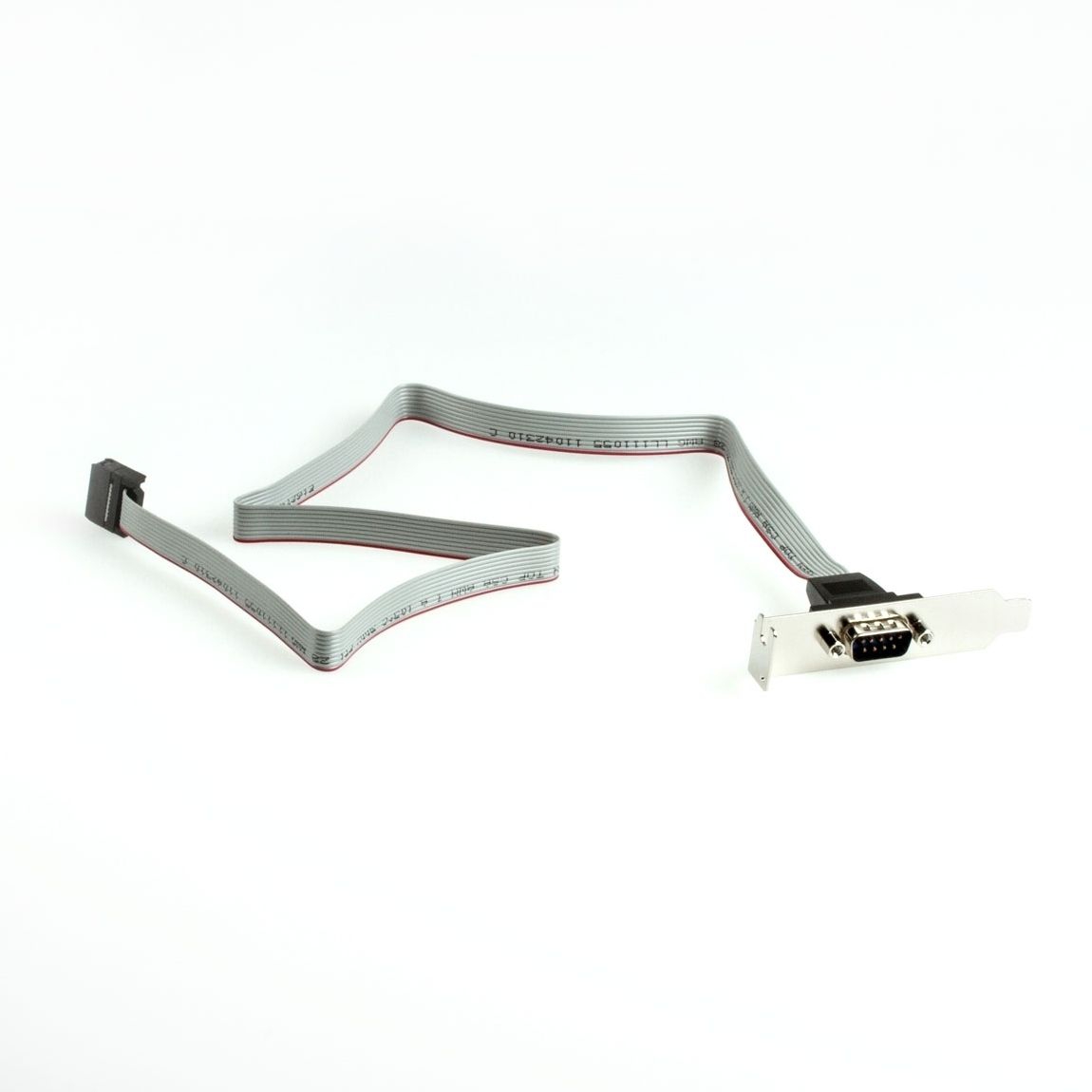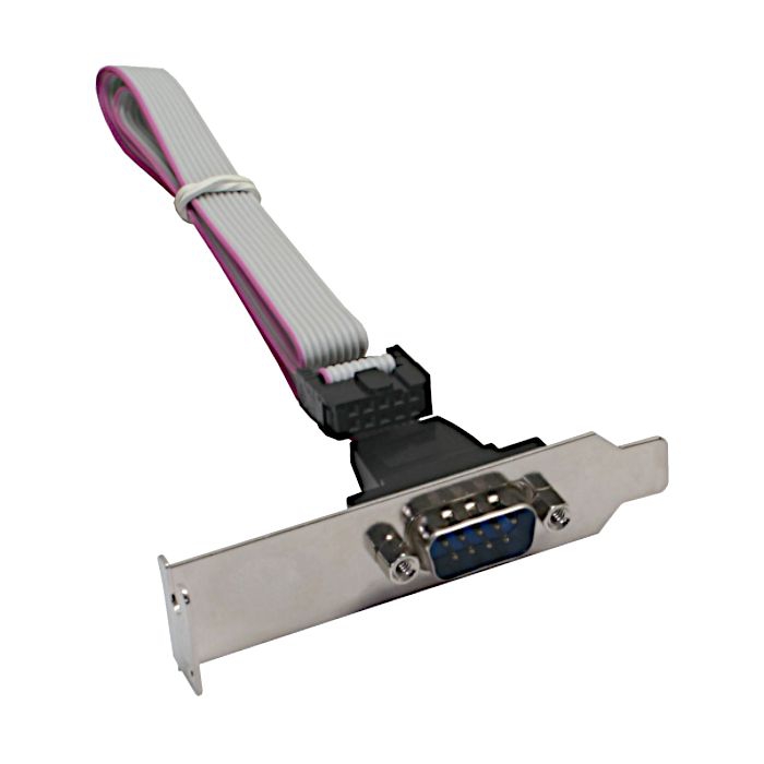 LOW-PROFILE-Slotblech mit DSUB-9-männlich (9 Stifte) zum Herausführen der seriellen Schnittstelle (RS232, COM), kürzeres Blech mit 8cm, intern EXTRA LANGES Flachbandkabel (ca. 60cm) mit 10-pol. IDC-Pfostenfeldverbinder (Rastermaß 2.54mm), 1:1-Belegung: DSub9-Buchsenleiste: 1-1, 2-2, 3-3, 4-4, 5-5, 6-6, 7-7, 8-8, 9-9, Pin 10 an Buchsenleiste nicht belegt
