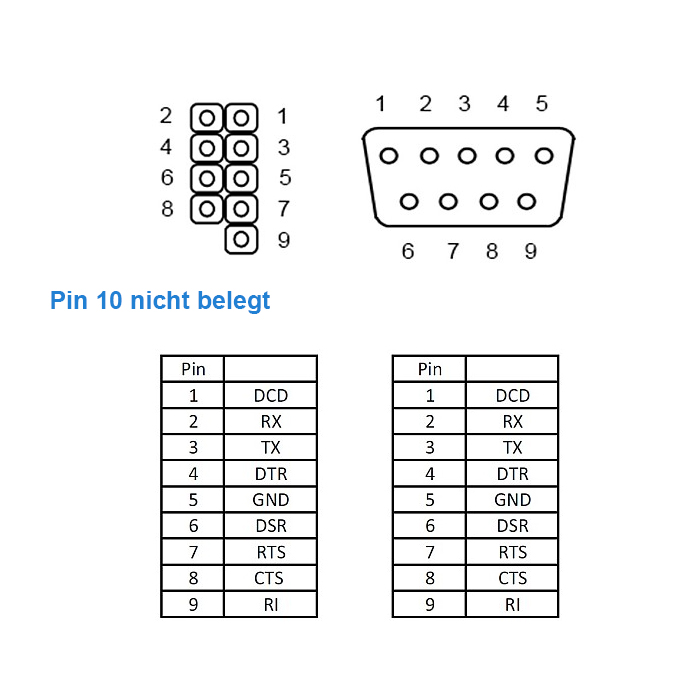 - Belegung (DSub -9m auf 10-pol Buchsenleiste): 1-1, 2-2, 3-3, 4-4, 5-5, 6-6, 7-7, 8-8, 9-9, Pin 10 an Buchsenleiste nicht belegt