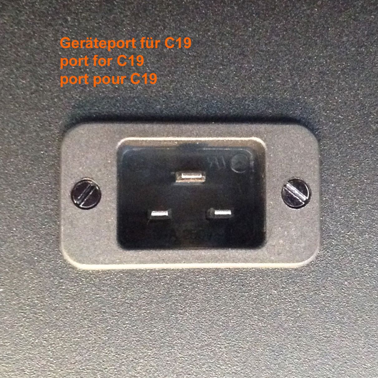 Geräteseitig ist das Stromkabel mit einem Stecker vom Typ C19 ausgestattet. Im Vergleich zur Bauform des normalen Kaltgerätesteckers C13 für PCs hat diese C19-Version von vorne gesehen eine rechtwinklige Form. Der C19-Verbinder ist die Kaltgerätestecker-Variante für 16 A. Eine andere Bezeichnung für die 16A Verbindung ist IEC-60320 bzw. IEC320.