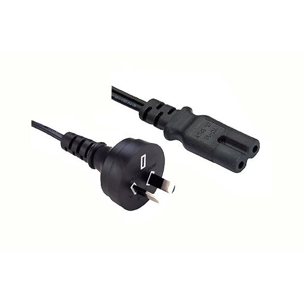 ... auf der anderen Seite des Kabels ist auch bekannt als Euro-8-Stecker, weil die Steckerform an die Ziffer 8 erinnert (UK: „figure of eight"). Euro-8-Stecker sind gemäß VDE für einen Verbrauch bis 2,5 A bei einer max. Betriebstemperatur von 70°C zugelassen. Der Kontaktabstand beträgt 8.6mm. Das 2-polige Stromkabel besitzt keine Erdverbindung. Daher hat der australische Netzstecker auch nur 2 Kontaktstifte.