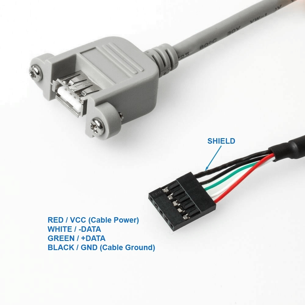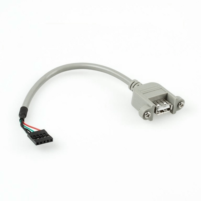 Die Buchse des Montagekabels (Typ A weiblich) ist anschraubbar. Die Schrauben sich im Lieferumfang enthalten und vormontiert. Auf der anderen Seite des Kabels befindet sich ein 5-poliger Stecker für ein Pfostenfeld (sogenannter Pfostenfeldverbinder oder Boardstecker). Das Rastermaß des Boardsteckers ist 2,54mm und entspricht damit den Erfordernissen der meisten Mainboards oder AddOn-Karten.