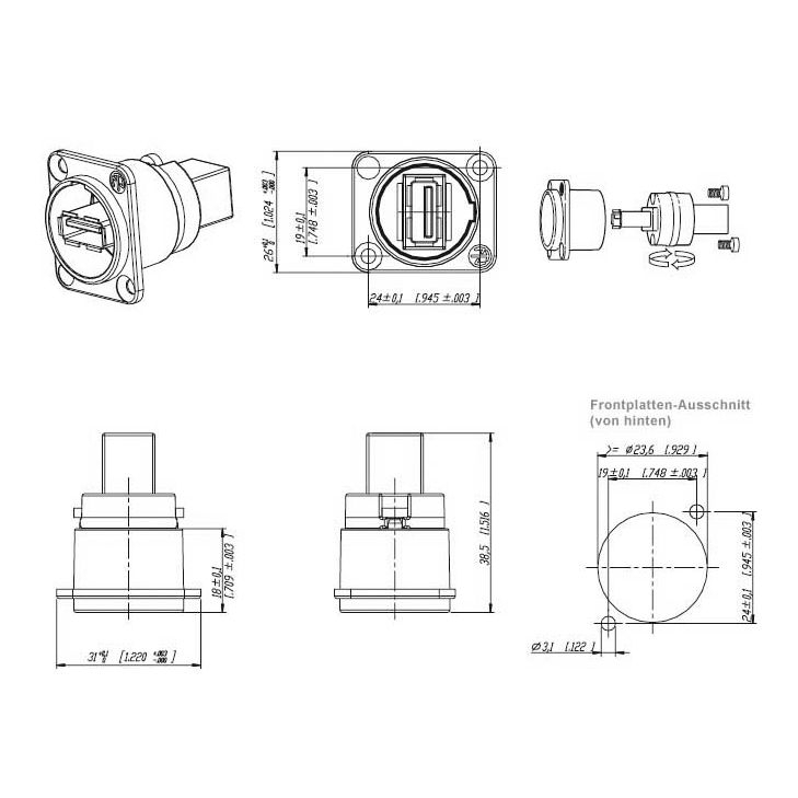 SB-Steckdose: Der hier angebotene schwarze USB-Einbauadapter ist ideal für die Montage eines USB-Ports vom Typ A oder B geeignet. Er ist vor allem für industrielle Zwecke, Cockpits, im Anwendungsfeld von Ton- und Videostudios und für selbst gebaute Gehäuse interessant. Intern als auch extern werden Standard-USB-Kabel an den Adapter angeschlossen. Die kreisrunde Gehäuseaussparung muss einen Durchmesser von 23,6 mm haben.