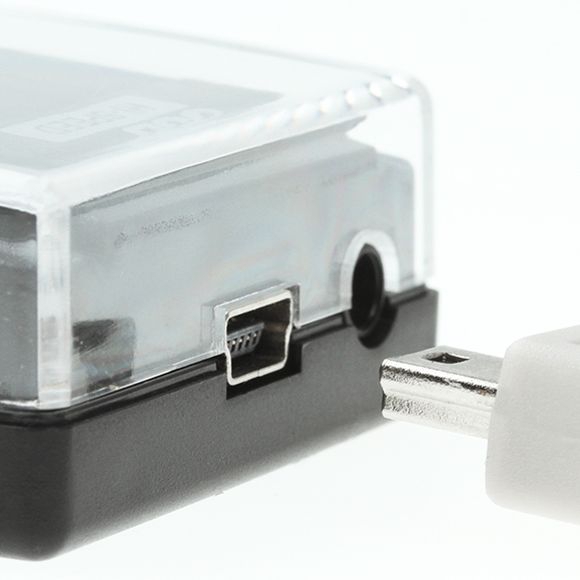 - Anschluss 2: Stecker USB 2.0 Mini B männlich (5-polig, kleiner Stecker an peripheres Gerät)