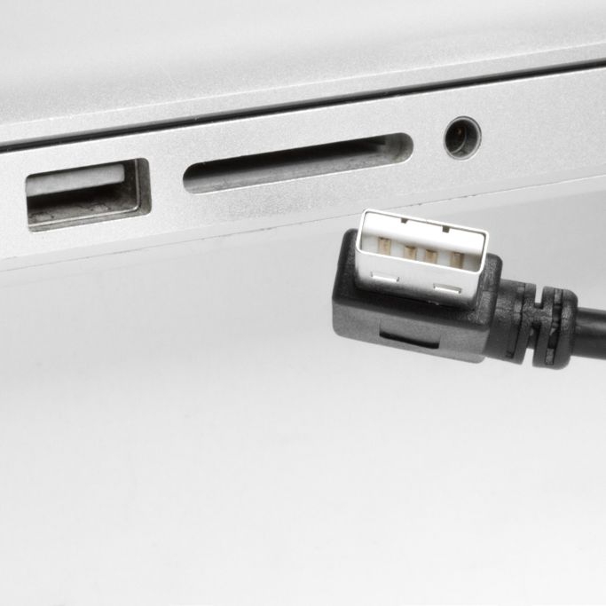 Wir bezeichnen das Kabel als 90° NACH RECHTS abgewinkelt. Bitte prüfen Sie die Ausrichtung der USB-A-Buchse Ihres PCs. Sie müssen die Position des weißen Kontakt-Trägers in der USB-A-Buchse beachten. Möglicherweise ist das, was wir als 'nach rechts' bezeichen bei Ihnen nach oben, unten oder links. Bitte schauen Sie sich obige Beispielanwendungen und Winkelrichtungen an.