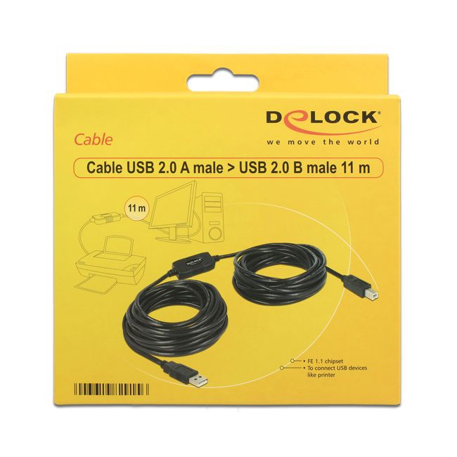 Extra langes USB-Kabel 11m, für USB 2.0 + USB 1.1, mit integriertem Verstärker (kleine Booster-Box in Kabelmitte), A-Stecker an B-Stecker, 480 MBit/s, Premium-Qualität, Farbe: schwarz