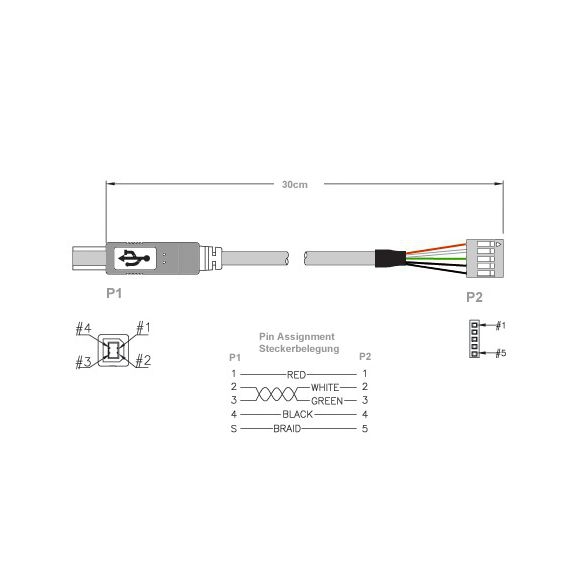 Belegungsreihenfolge des Boardsteckers: rot (VCC, +5V), weiß (D-), grün (D+), schwarz (GND, Masse), schwarz (Abschirmung). Dies entspricht dem Marktstandard.