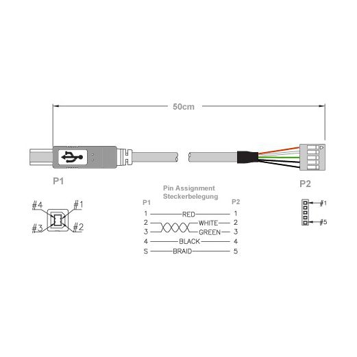 Belegungsreihenfolge des Boardsteckers: rot (VCC, +5V), weiß (D-), grün (D+), schwarz (GND, Masse), schwarz (Abschirmung). Dies entspricht dem Marktstandard.