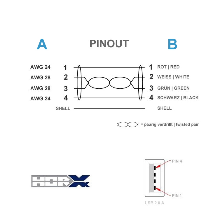 - Stärke der Kupferadern gemäß USB-Norm: AWG28 + AWG24
