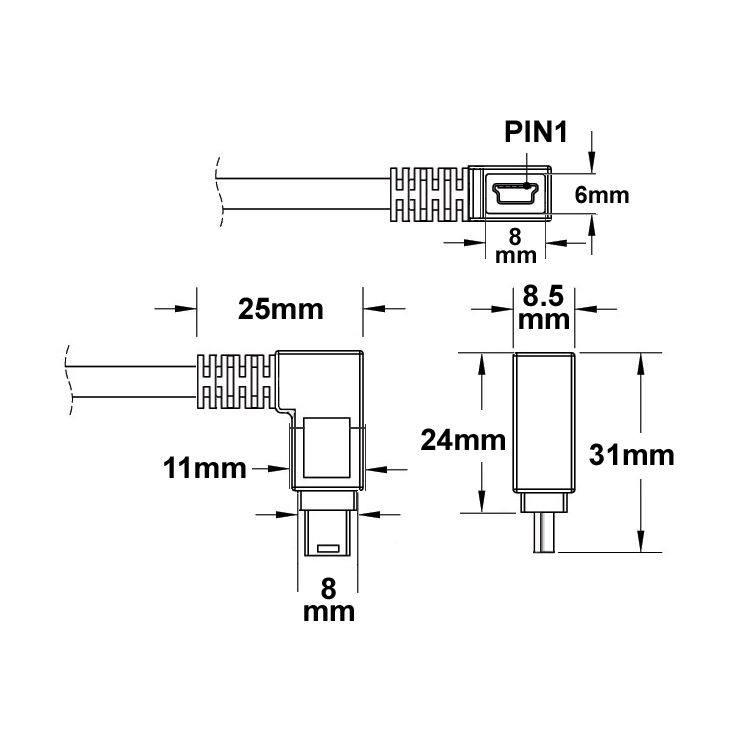 - USB-Stecker Typ Mini B 90° gewinkelt LINKS (an peripheres Gerät/downstream)