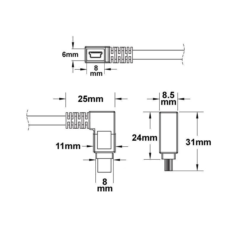 Wir bezeichnen das Kabel als 90° NACH RECHTS abgewinkelt. Ob die Bezeichnung NACH RECHTS bei Ihnen stimmt, ist natürlich von der Position des Mini-B USB-Buchse des Gerätes abhängig. Bitte prüfen Sie daher die Ausrichtung der Mini-B-Buchse Ihres USB-Gerätes. Die Buchse ist trapezförmig, eine Seite ist breiter, die andere schmaler.