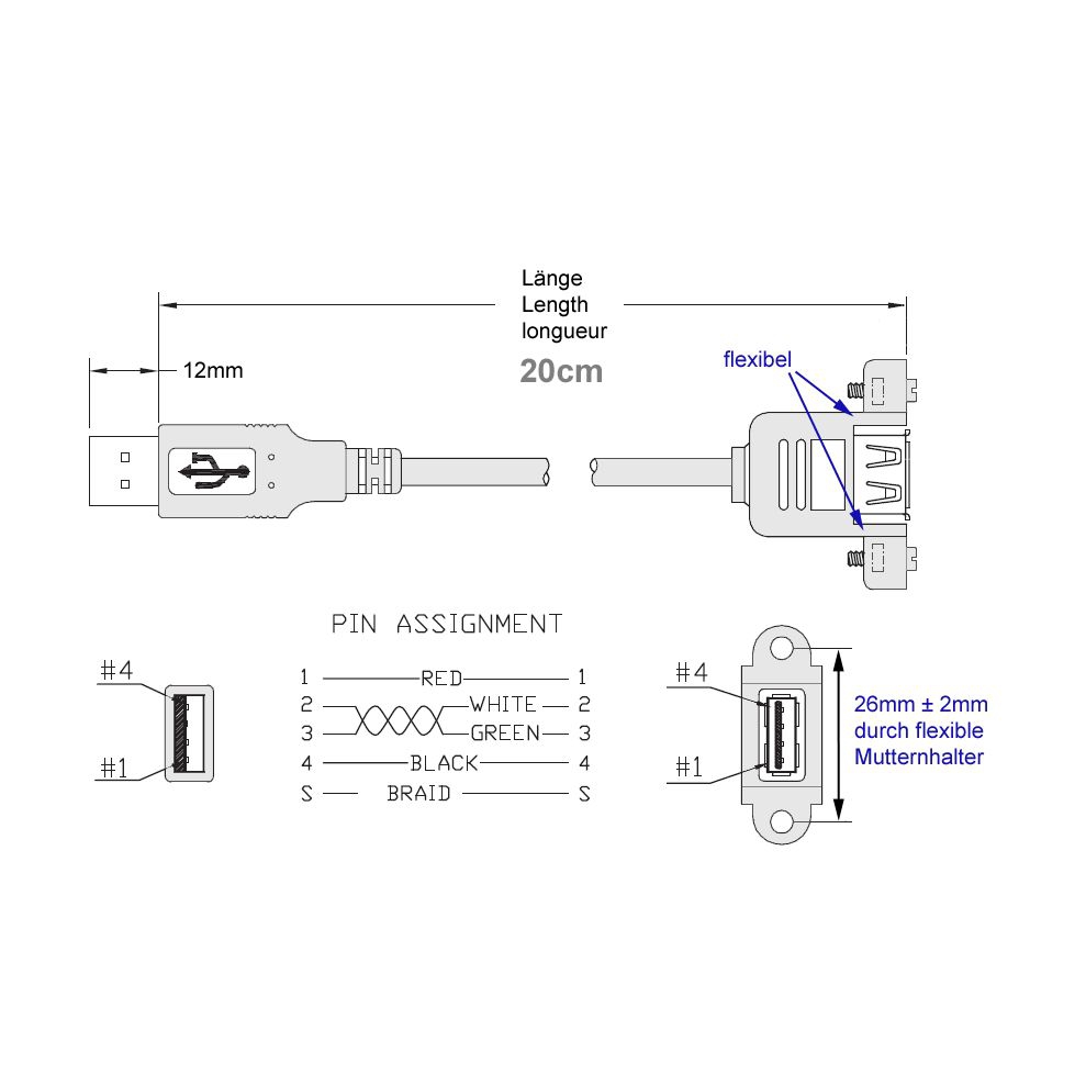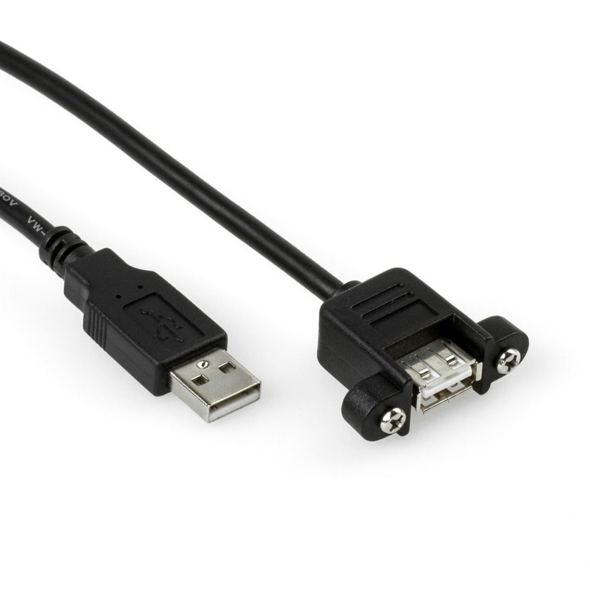USB-Montagekabel 20cm: USB-A-Buchse (anschraubbar) an USB-A-Stecker (gerade), für USB 2.0 und USB 1.1 (bis 480 MBit/s), doppelt abgeschirmt, inkl. Schrauben