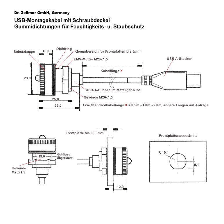 - Buchse USB. 2.0 Typ A (anschraubbar mit schraubbarer Kappe)