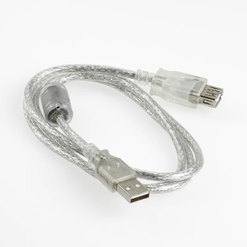USB 2.0 Verlängerungskabel mit FERRITKERN, 1m, Typ: AA Stecker/Buchse, für USB 1.1 und USB 2.0 (bis 480 MBit/s), Farbe: transparent-silber