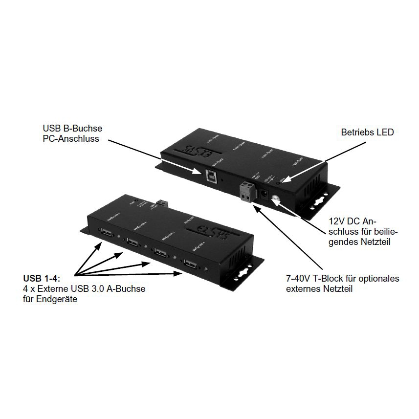 4 Port USB 3.0 HUB im Metall-Gehäuse für industriellen Einsatz, 4x A-Buchse + 1x B-Buchse (alle verschraubbar), mit Überspannungsschutz, Wandmontage möglich, inkl. USB 3.0 Kabel und ext. Netzteil 3A