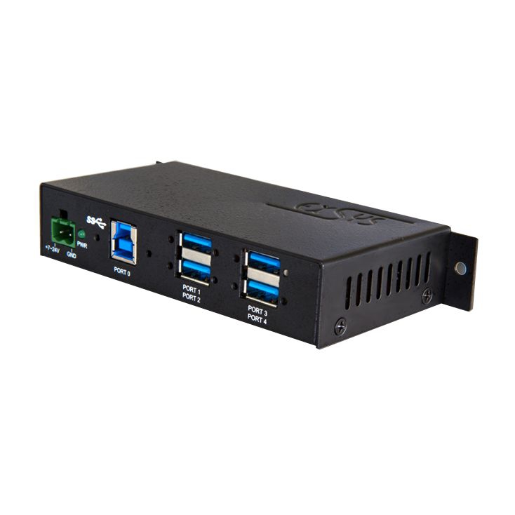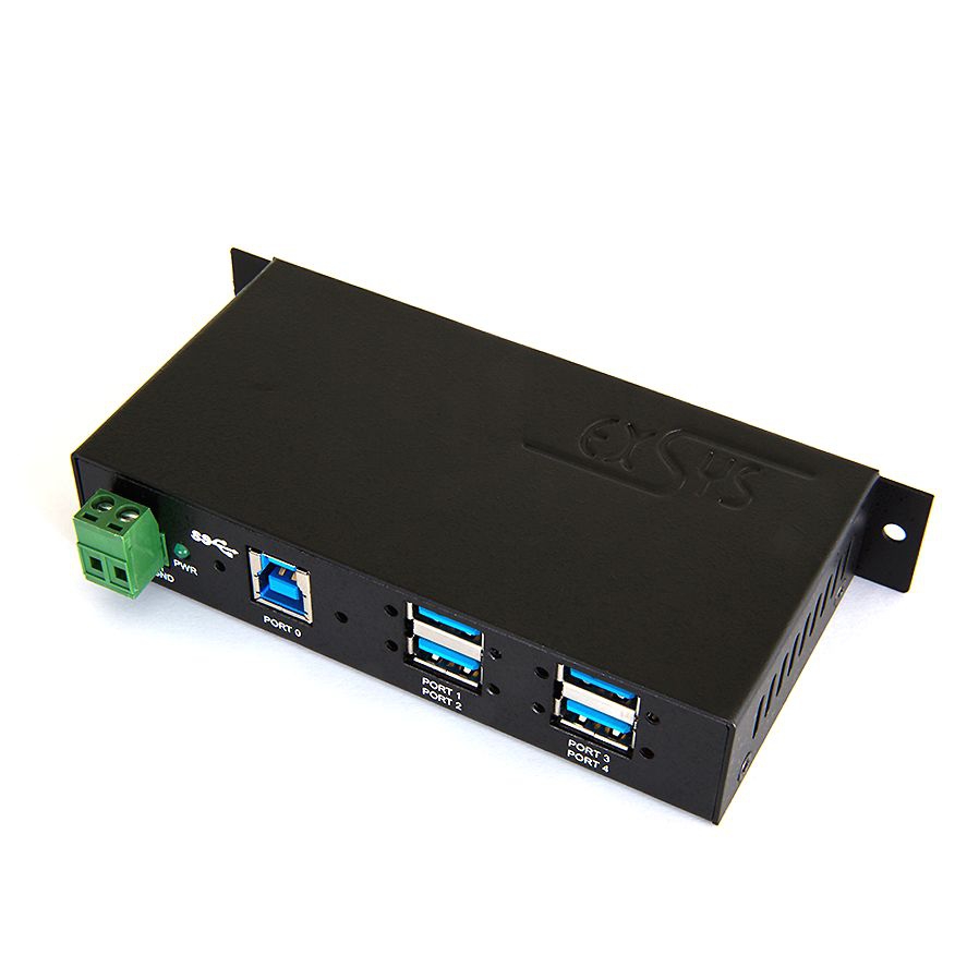 Der robuste, industrietaugliche EX-1185HMVS-2 USB-Hub mit vier USB 3.2 Gen1 (früher USB 3.0) verschraubbaren Ausgängen und 15KV ESD Überspannungs-Schutz kann an die Wand oder auf einer Trägerschiene installiert werden. Er wird an einen Computer oder Server mit dem mitgelieferten USB 3.2 Gen1 Kabel angeschlossen. Er unterstützt Datenübertragungsraten von bis zu 5Gbit/s und ist abwärtskompatibel bis USB 1.1. Er kann mit USB-Bus-Power (7-48V) oder über eine zwei drahtige Klemmleiste mit Strom versorgt werden.