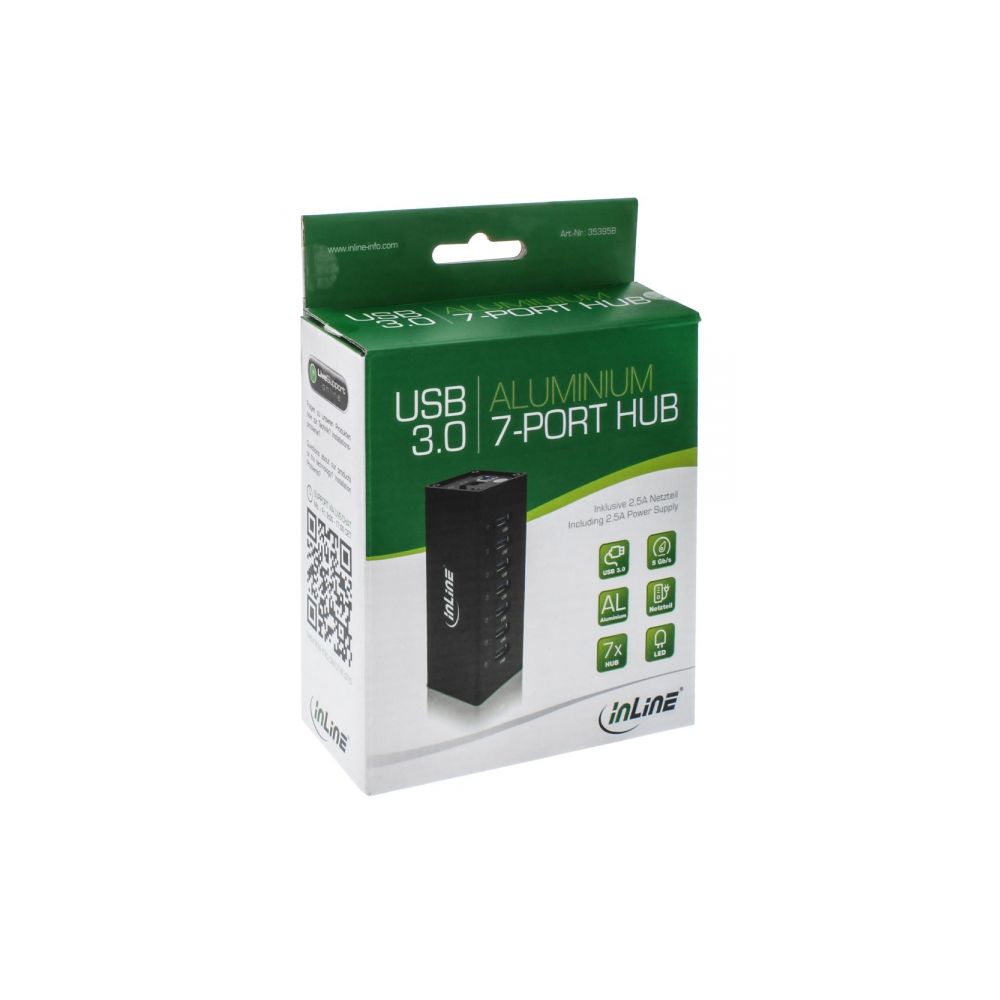 Der 7-Port USB 3.0 Hub überzeugt durch seine wertige Verarbeitung und sein solides Alu-Gehäuse. Intern wird der zuverlässige Chip VL811 von VIA Lab's (Super Speed USB 3.0 Hub Controller) verwendet, der sich durch breite Kompatibilität auszeichnet. Das 3A-Netzteil ist von Flypower, ebenfalls ein sehr guter Hersteller.