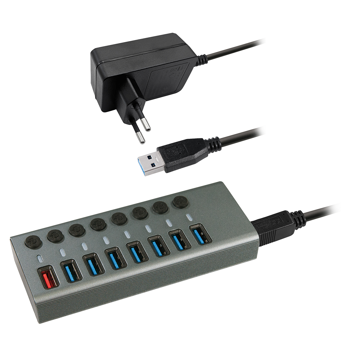 8 Port USB 3.0 HUB im Metall-Gehäuse, 7x USB-Buchse + 1x Ladebuchse, Ports einzeln zuschaltbar, inkl. 1m USB-Kabel und 3A Netzteil