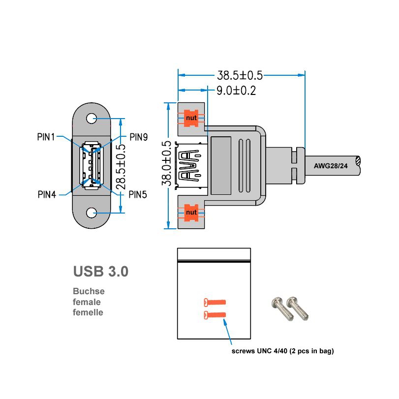 Die A-Buchse des USB 3.0 Montagekabels ist mit UNC 4/40 Schrauben anschraubbar. Die dazugehörigen Muttern (nuts) sind im Buchsengehäuse eingossen. Die 2 Schrauben sind im Lieferumfang enthalten.
