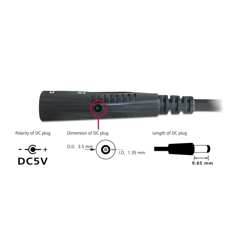 - mit DC-Stromanschluss für Netzteil (Abmaße: innen 1.35mm, außen 3.5mm, Länge 9.65mm)