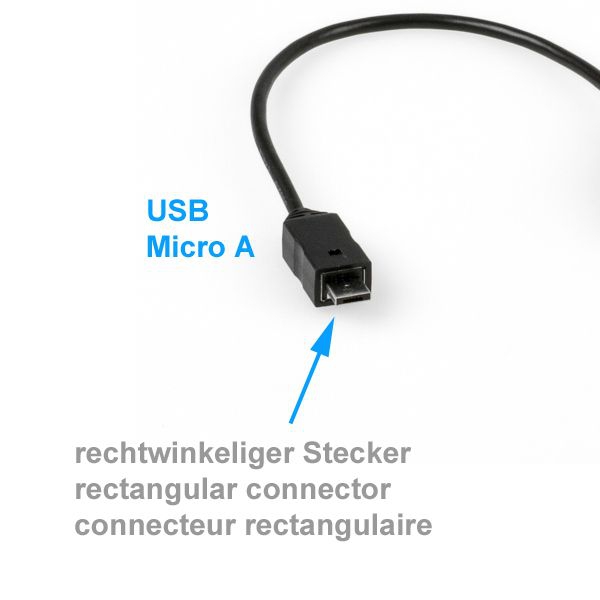 Bitte beachten Sie, dass der USB Micro A Stecker eine rechtwinkelige Form hat, ohne abgeschrägte Seiten. Die entsprechende Micro A Buchse, in die das Kabel eingesteckt werden soll, muss daher ebenfalls rechtwinkelig sein.
