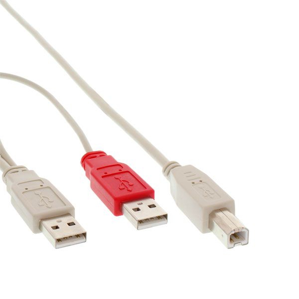 Dieses USB 2.0 Y-Kabel bündelt den Strom von zwei USB-Anschlüssen für ein USB-Gerät mit höherem Energiebedarf. Damit lassen sich endlich auch Peripheriegeräte ohne zusätzliches Netzteil betreiben, die mehr als 500mA via BusPower benötigen (z.B. externe Festplatten, CoolerPads, GPS-Empfänger). Via USB werden PC-seitig meist nur 500mA je Port zur Verfügung gestellt (Betriebssystem-Einstellungen beachten). Das Kabel greift mittels der 2 USB-A-Stecker je Port 500mA ab, so dass man insgesamt auf 1A BusPower kommt. Das Y-USB-Kabel ist auch ideal für Notebooks. Der rote Stecker dient allein der BusPower-Abzweigung.