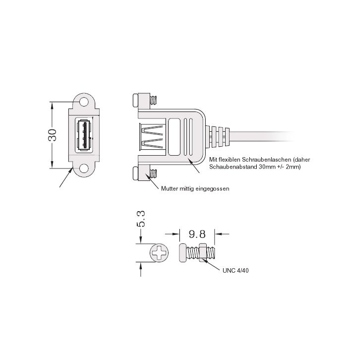 Bzgl. der Abmessungen der Montagebuchse gibt es oben eine technische Zeichung. Der Abstand der beiden Löcher beträgt bei diesem Montagekabel 30mm. Die beiden Kunststoff-Laschen der USB-A-Buchsenhalterung sind flexibel. Daher kann auch ein Schraubenabstand von ca. 28mm bis ca. 32mm realisiert werden.